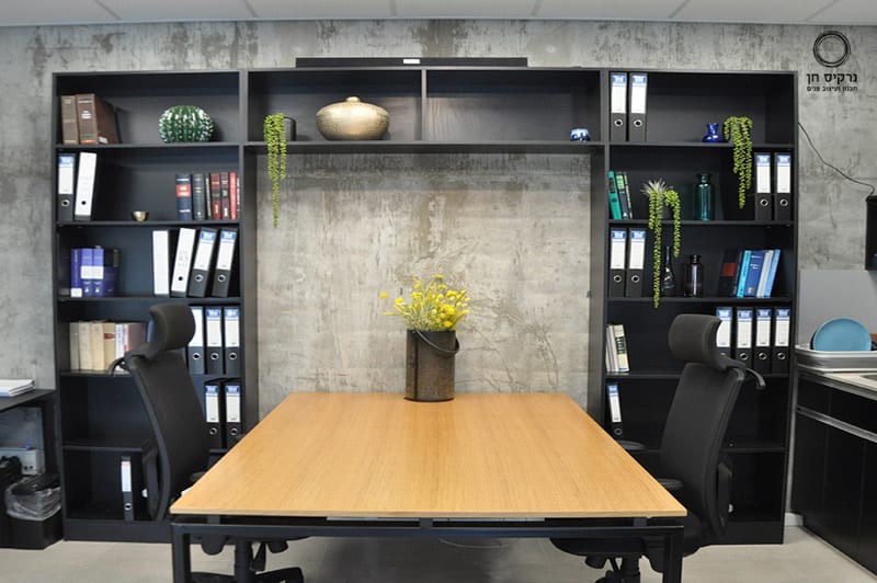 ביחד עם האדריכלית קרן תמם קיבלנו לידינו את "שלד" המשרד. בו תוכננו פרטי נגרות ייעודיים למטבח, אחסון, שולחנות עבודה וכן דלפק מזכירות , בגימור, צבע ושפה שנבחרה ביחד. בסיור משותף שלי עם הלקוח נבחרו הריהוטים המשלימים – כסאות, מידופי נוי ואקססוריז שונים. באופן מפתיע מצאנו בסיור גוף תאורה שמזכיר באופן לא יאמן את האלמנט המרובע מהלוגו של הלקוח – הבחירה בו היתה קלה ומיידית.