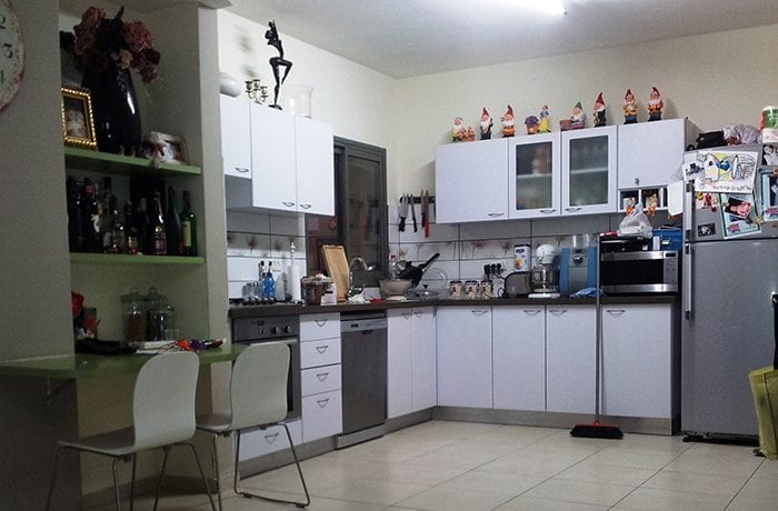 צורתו המקורית של המטבח היתה "ר". הוספתי לו צלע נוספת וכעת הוא בצורת "ח". שטח האחסון במטבח החדש גדול ב- 50% מול המטבח הקודם.
